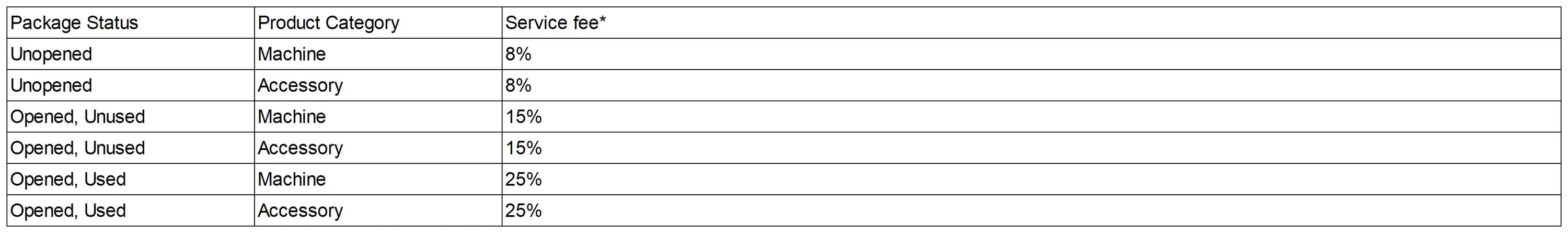 Note: The percentage of service fees mentioned above is based on the total price of goods. If you require a replacement machine that costs more than you paid for, you'll have to pay the difference.