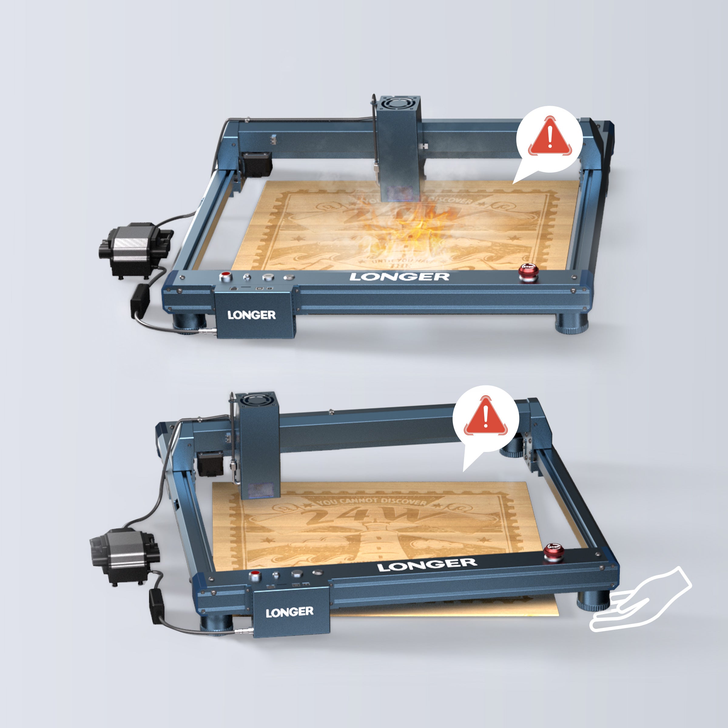 Longer LaserB1 has 8 safety protection functions, namely moving/flame/offline/stationary/safety lock/eye protection/emergency stop button/reset to zero. And the laser head automatically returns to zero to avoid burning out during ignition