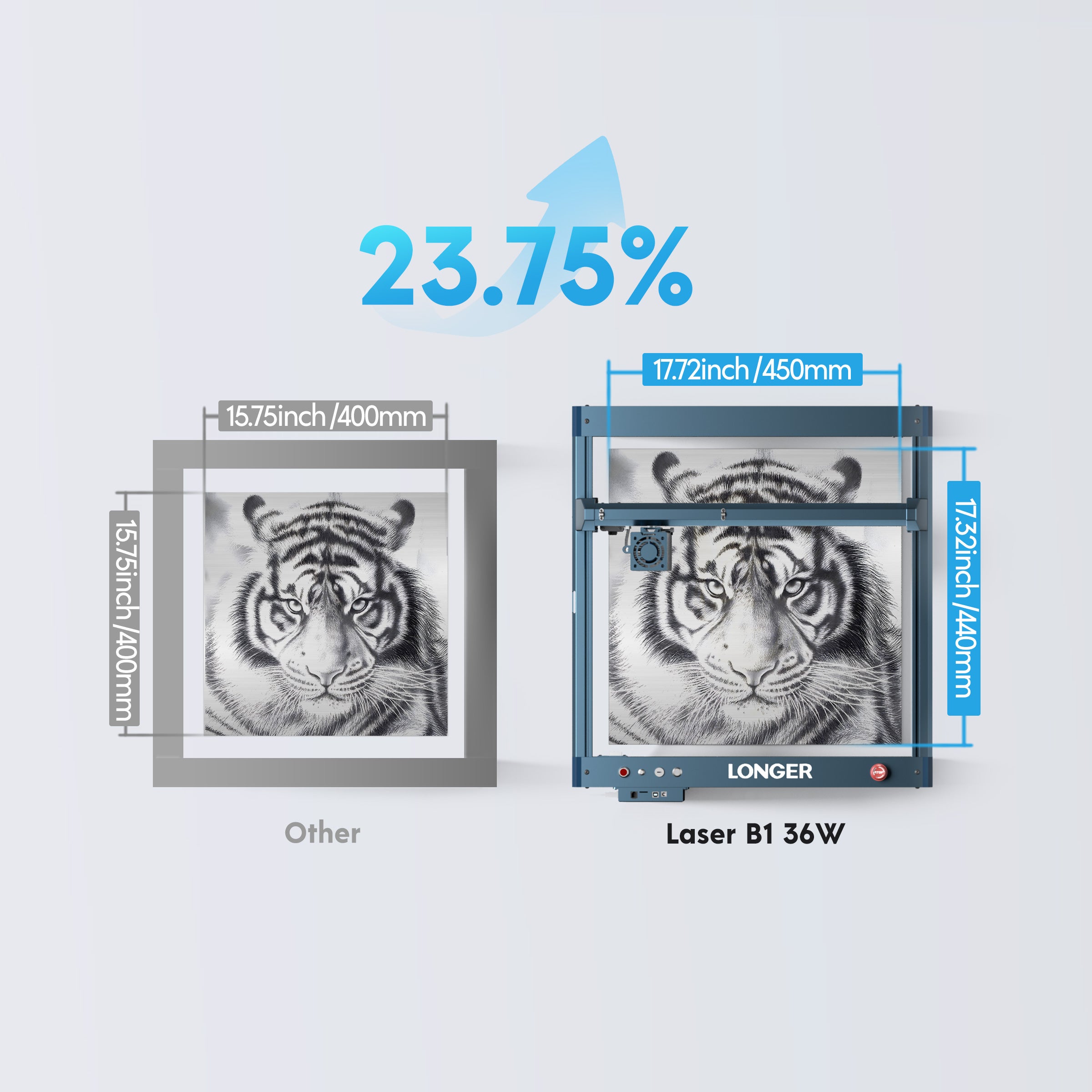 B1 20W features a 450x440mm (17.72"x17.32") work area, providing ample space to unleash your creativity