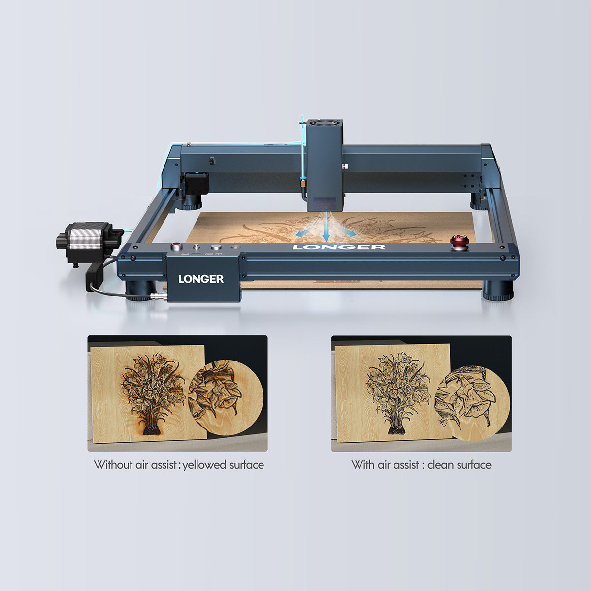 • Equipped with smart Air-Assist system automatically controlled by lightburn