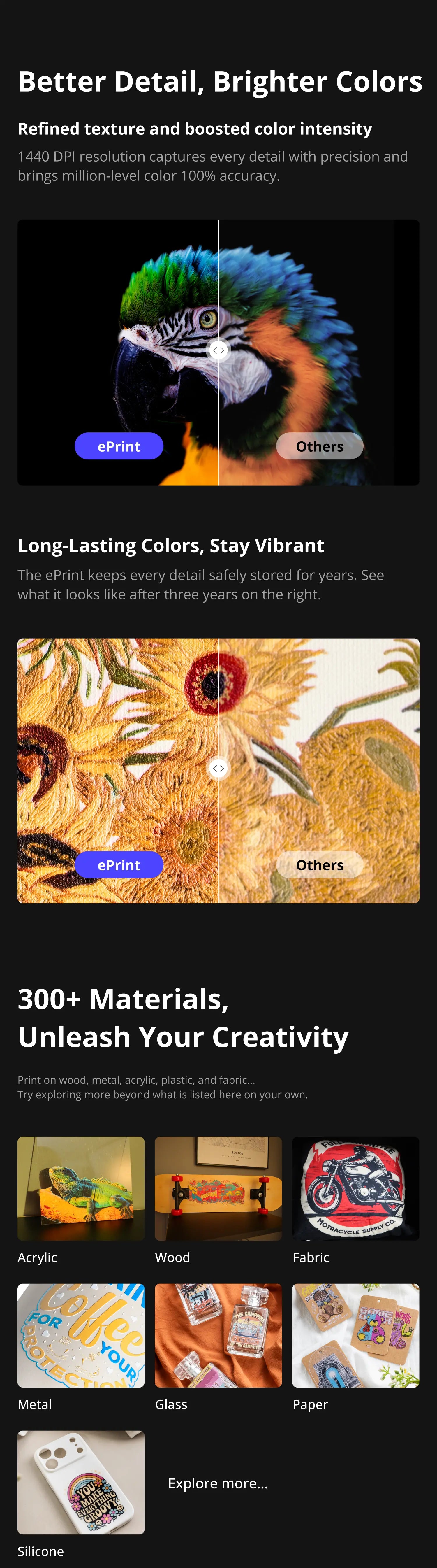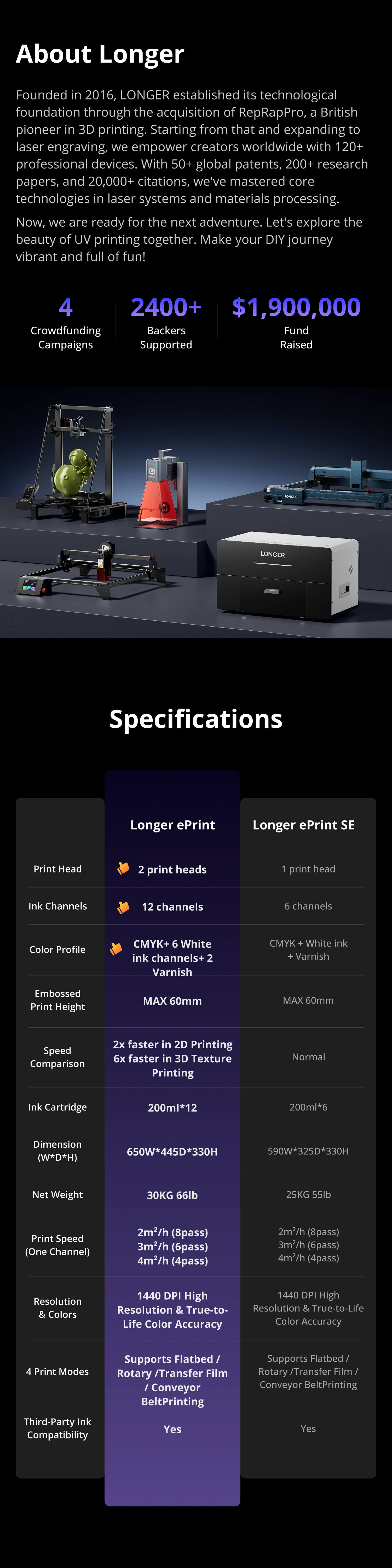 To show our appreciation for your early trust and support, we're offering an exclusive VIP Offer on the Longer ePrint UV printer for our first-wave supporters. By placing a $50 deposit, you can lock in the VIP price of the ePrint SE ($1,299) or the ePrint ($1,699), saving you $900 or $1,300 off the retail price! The deposit is also 100% refundable if you change your mind before the official launch.