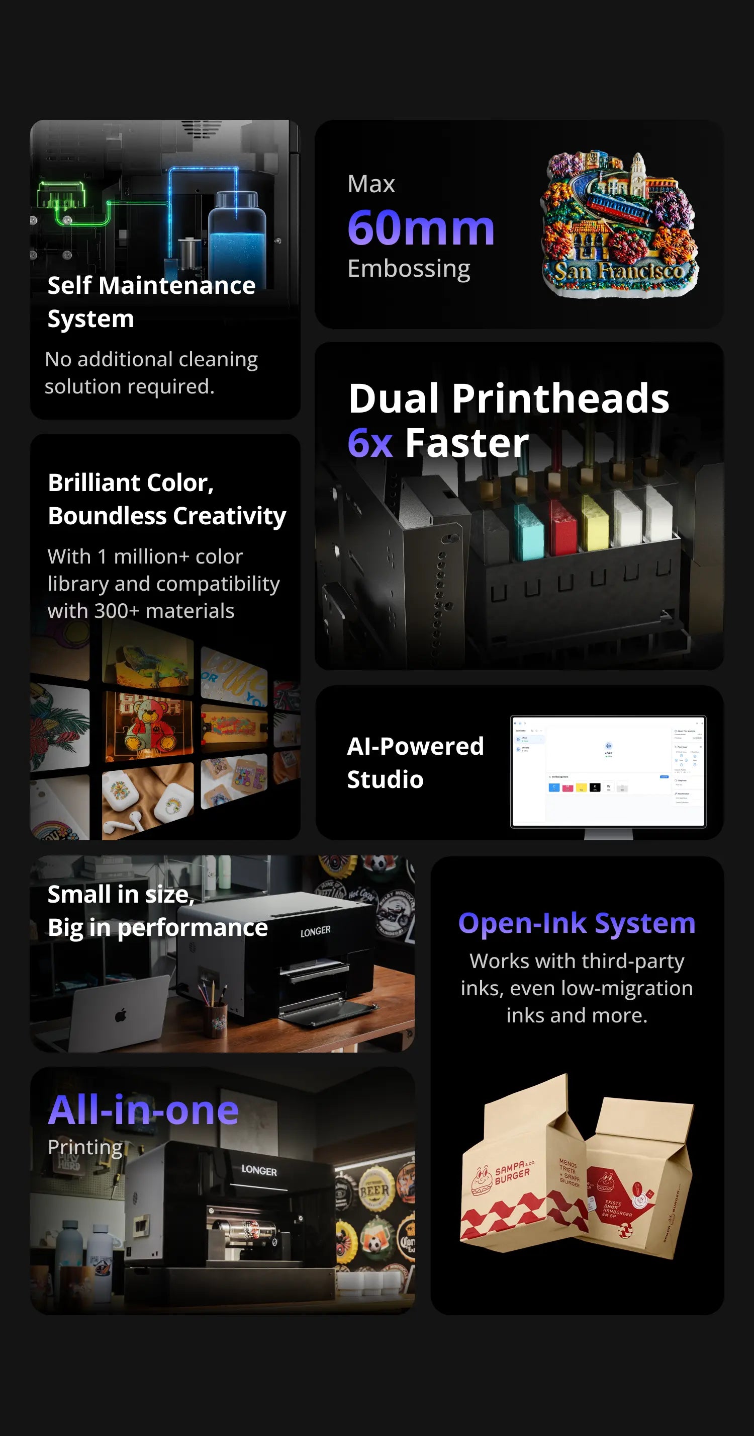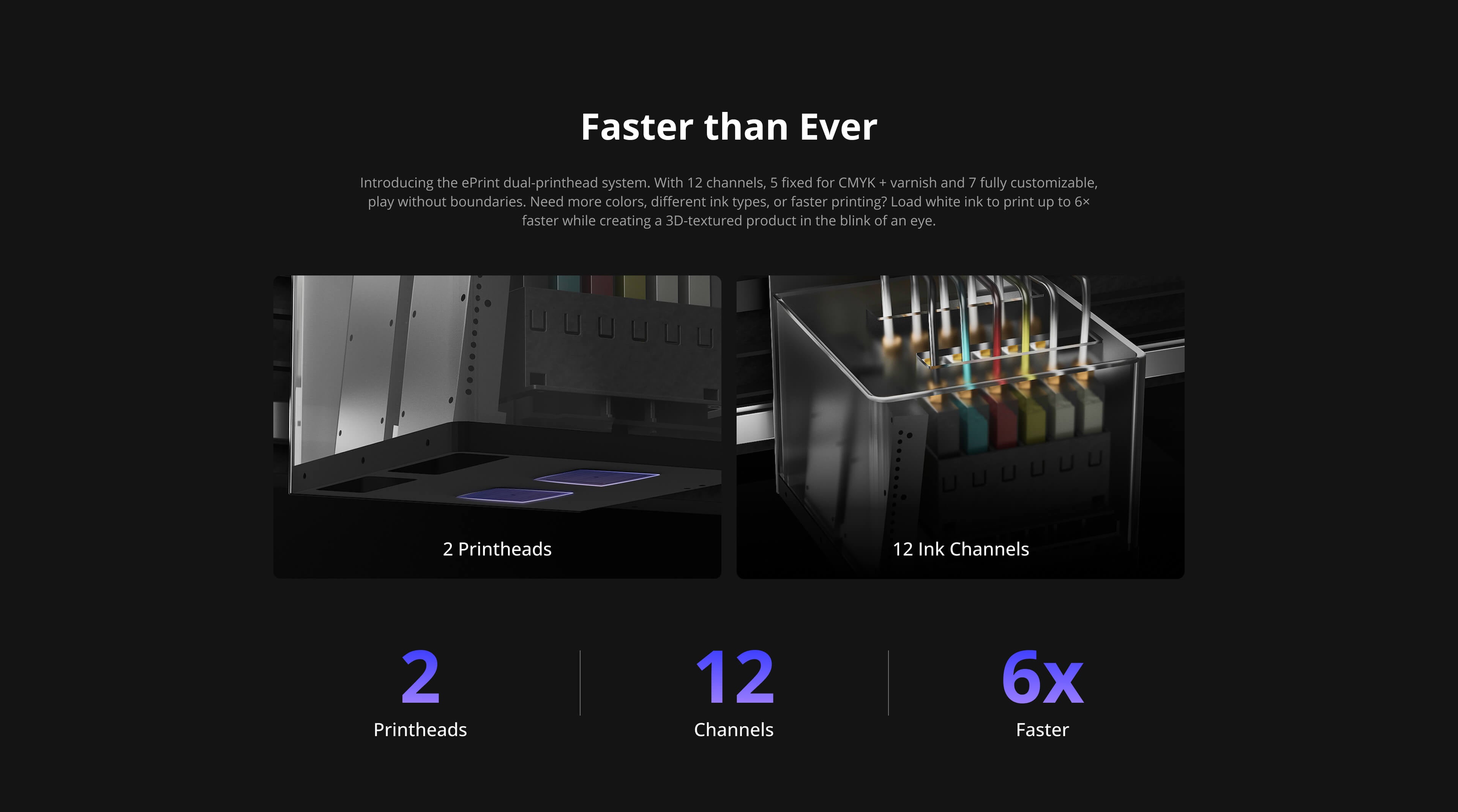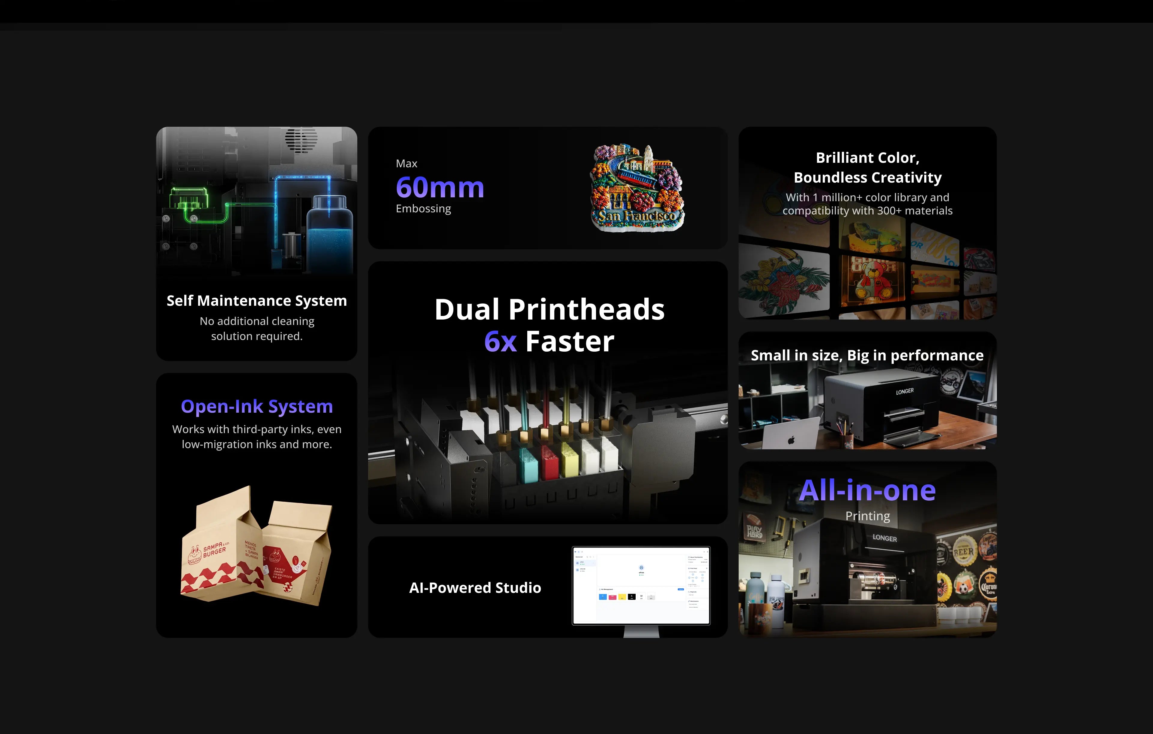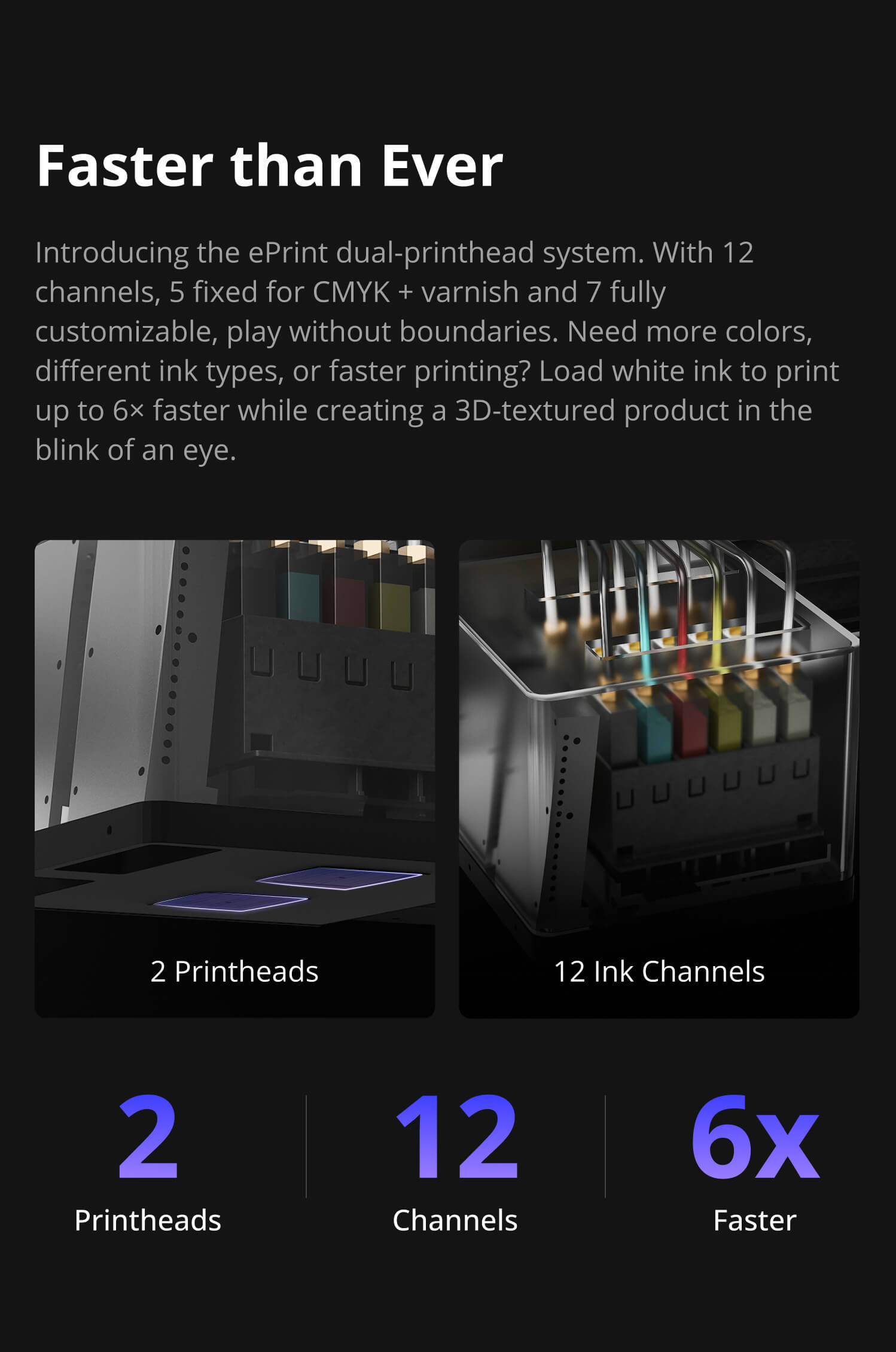 • The world’s first dual-head UV printer with 12 ink channels, delivering up to 6× faster printing than traditional single-head machines