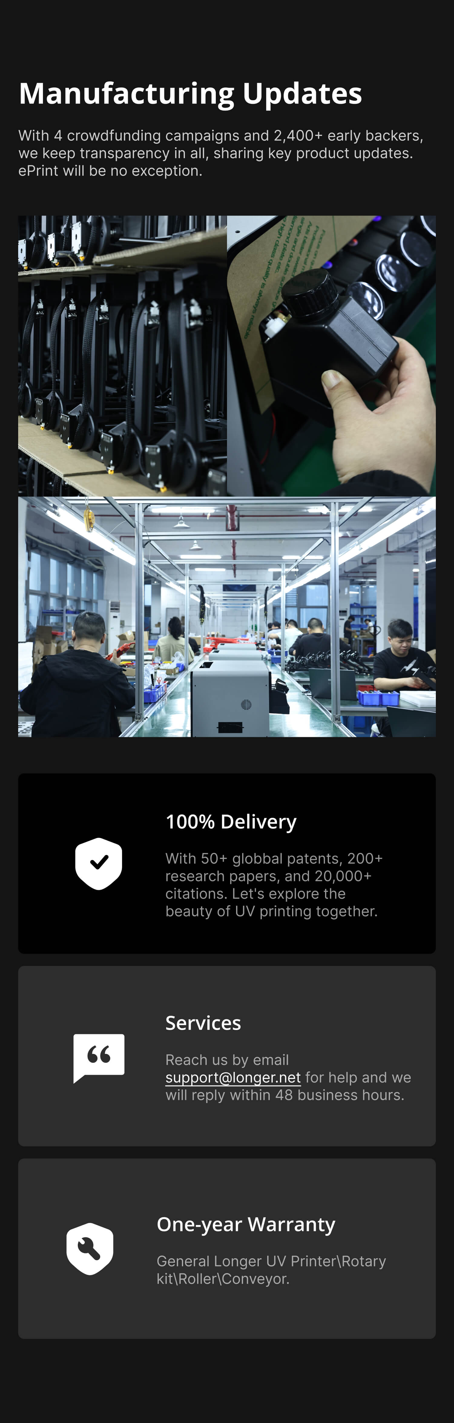 The Longer ePrint UV printer will officially launch on Kickstarter in soon. Shipping is expected to begin in 2026. You’ll receive a tracking number once your package has shipped. The exact delivery time may vary depending on your delivery address and the courier service.