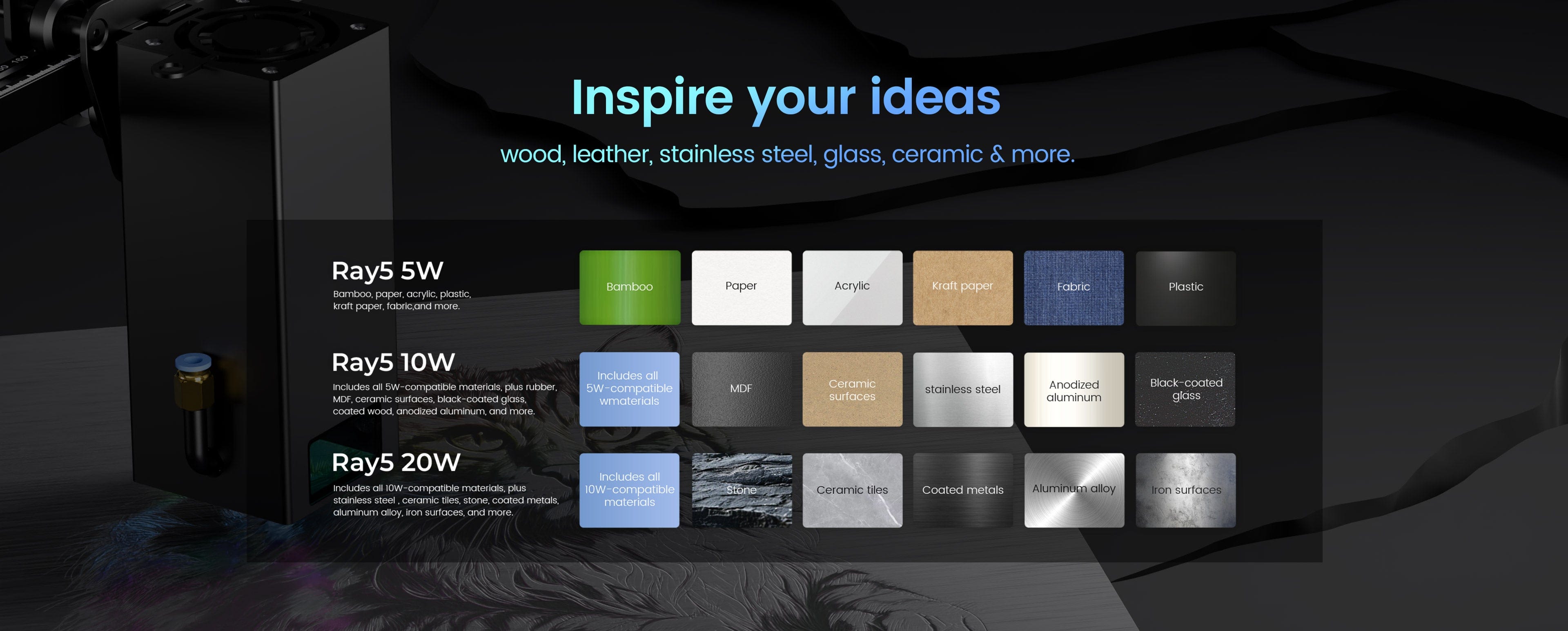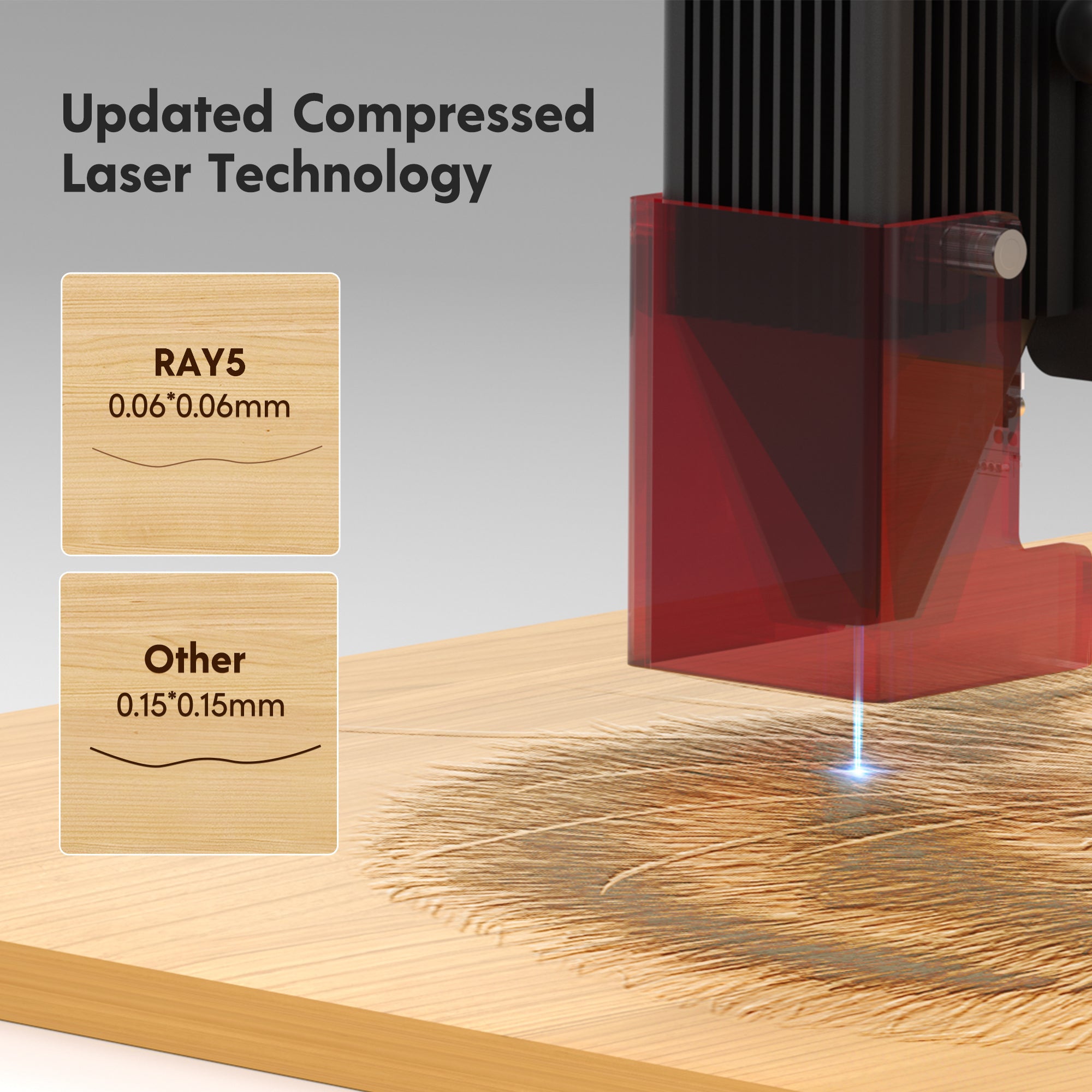 In addition to different power levels, the working area is also different. The area of RAY5 5W & 10W is 400x400 mm (15.75x15.75 inches), and the area of RAY5 20W is 400 x 365 mm (15.7 x 14.4 inches). RAY5 20W offers more power, which means faster speeds, for experienced users looking for advanced engraving and cutting capabilities. If you pursue efficiency and have higher cutting requirements, please choose RAY5 20W; If you pursue fineness and engraving precision, then RAY 5W & 10W fits you